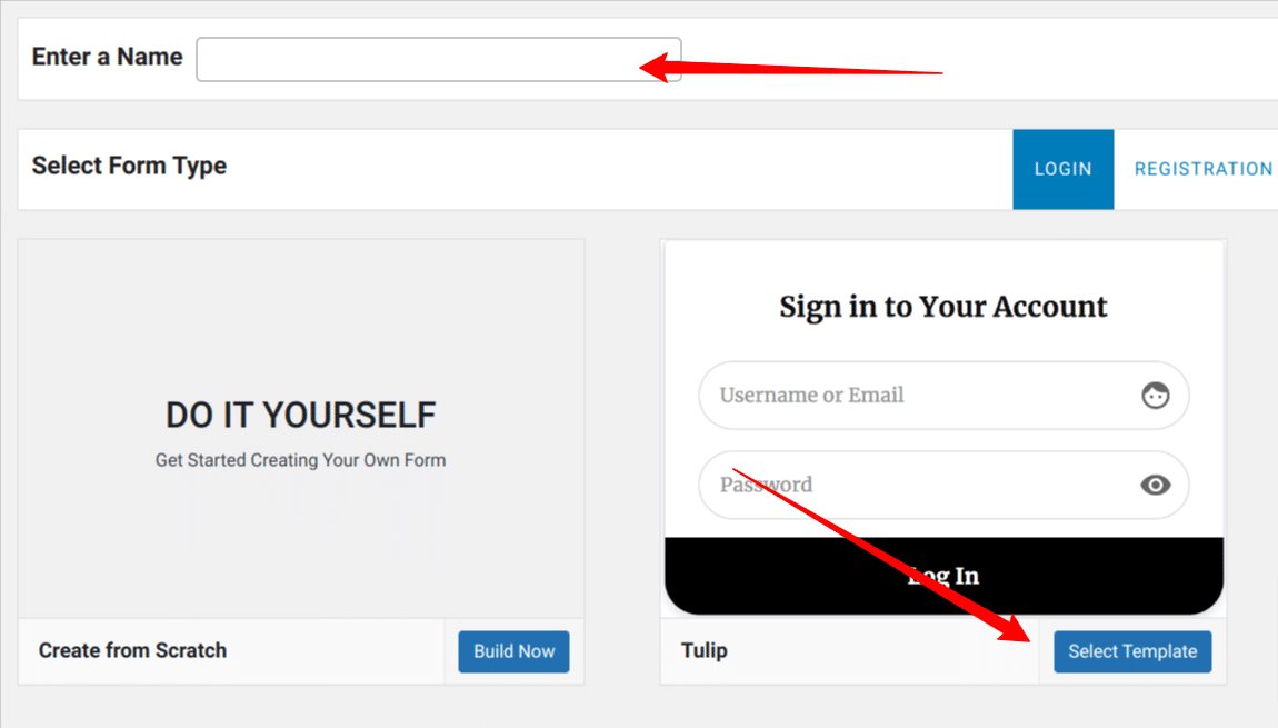 Navigate to ProfilePress > Forms & Profiles, click “Add New,” choose the Drag & Drop Builder, enter a form name – Login, and choose the first template from the available login form templates.